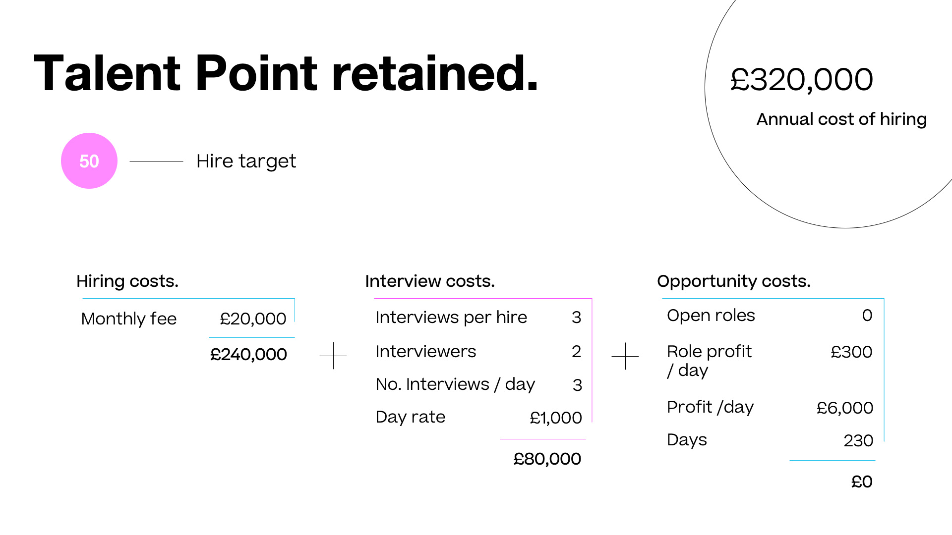 As you can see, although they were spending a lot on agency fees and one internal recruiter (£492,000), this number was almost matched by lost revenue due to staff being in interviews (£420,000) and dwarfed by lost opportunity cost of not making hires and therefore having less ‘billable consultants’ to work on paid projects (£1,380,000).